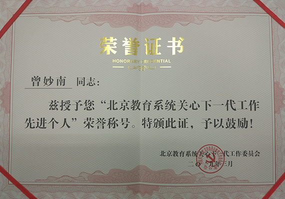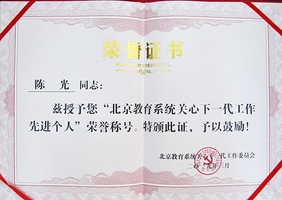 我校关工委荣获“北京教育系统关工委信息宣传工作先进单位”荣誉称号;我校关工委办公室主任谢琳同志荣获“北京教育系统关工委信息宣传工作先进个人”荣誉称号。