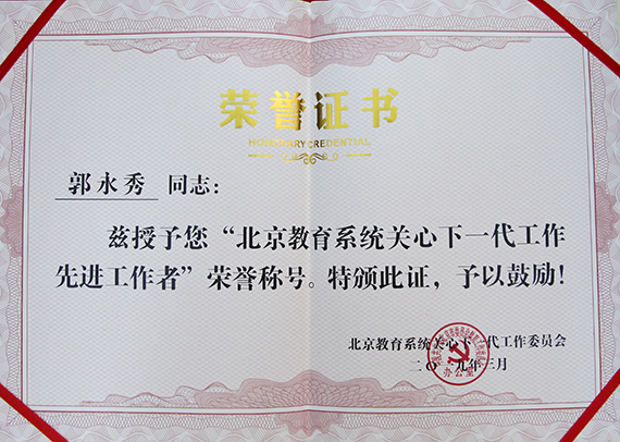 我校365英国上市公司教职工党委副书记、365英国上市公司工作处副处长、关工委副秘书长郭永秀同志荣获“北京教育系统关心下一代工作先进工作者”荣誉称号。