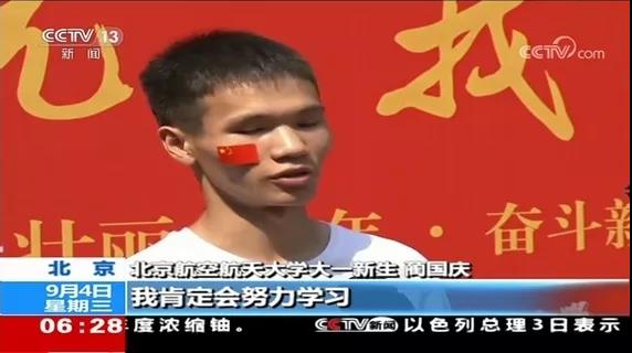 【同期】北京航空航天大学大一新生蔺国庆:今年是祖国(新中国)70华诞,我自己也十八岁了,进入北航,是我自己的成人礼,在这个新的起跑线上,我肯定会努力学习,青年强则国强,我们进步,国家也会在进步。
