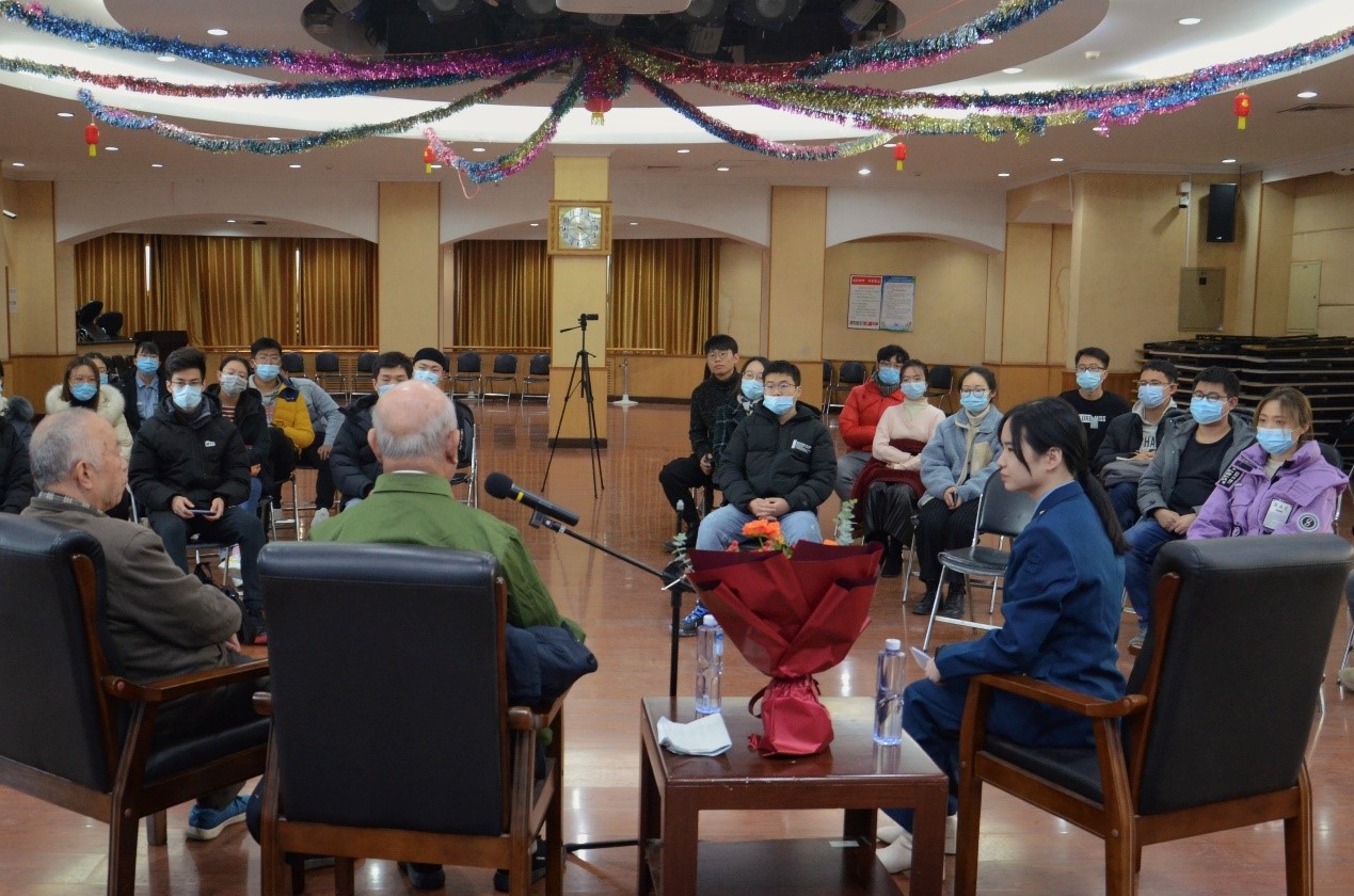 讲故事环节,明玉清老战士从自己1948年加入中国人民解放军的经历讲起,先是讲述了辽沈战役的情况,让同学们充分体会到了当时中国共产党的艰苦作战条件。明老说:“最后能打胜仗靠的不是装备,靠的就是不屈不挠,艰苦奋斗的精神”。明老接着讲述自己加入空军的经历,其1950年被分配到南苑六航校学习地勤,1953年参加抗美援朝空军轮战。当时面临着条件艰苦、装备不足等多种问题,临时机场甚至都是用铺在稻草上的钢板组成的。明老表示:“我们是人民的军队,相信人民,依靠人民,一切为了人民,这就是我们制胜的法宝。”当被问到“在这样艰苦的条件下,您是抱着什么信念坚持下来”时,明老表示,自己家里条件艰苦,是中国共产党救了他们,给了他们翻身做主人的机会。“我一定要报答党的恩情”,他庄重回答。