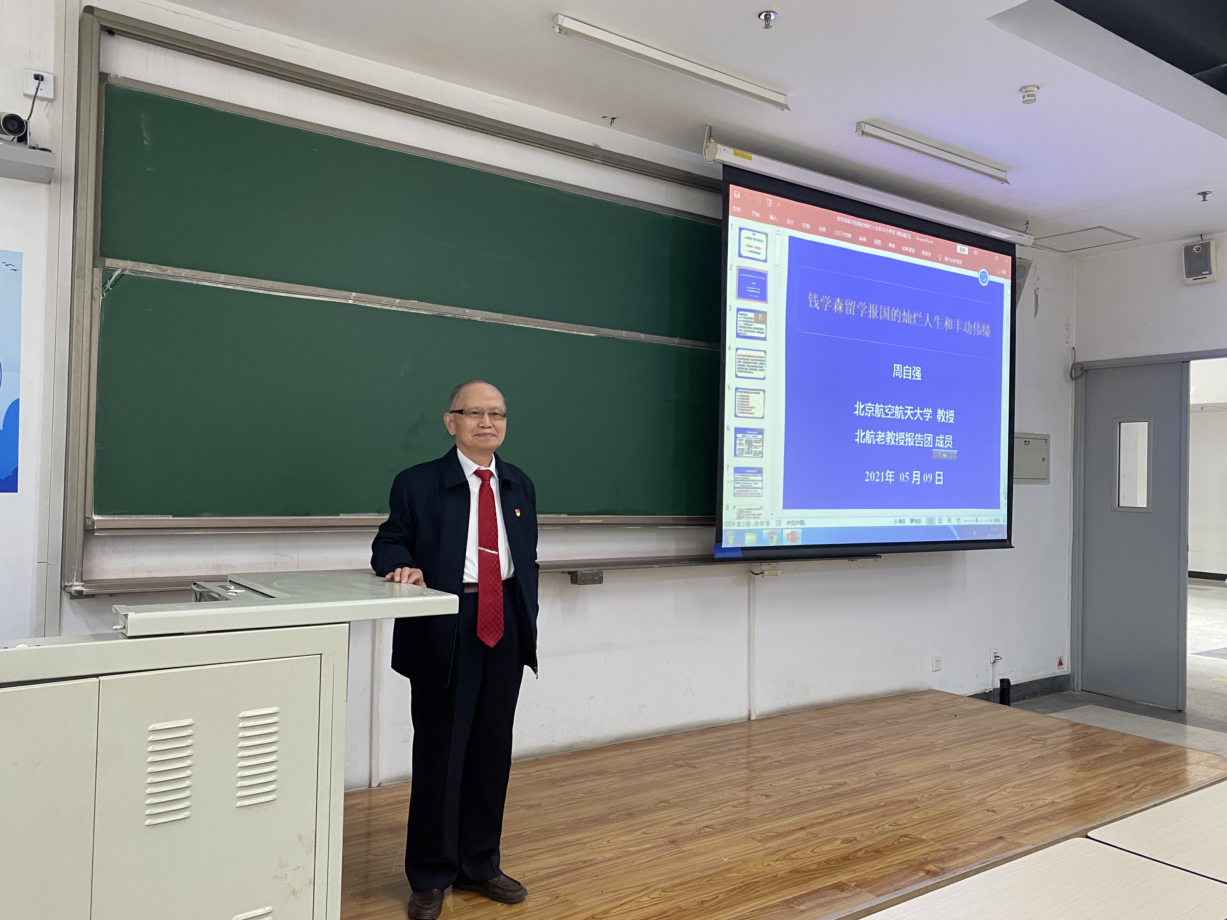 2021年5月9日下午,北航科协大讲堂第十一讲——“钱学森留学报国的灿烂人生和丰功伟绩”报告会在沙河校区J3-102教室举办。2021年恰逢钱老诞辰110周年,北航“关心下一代工作委员会”委员、北航校友总会顾问周自强教授为同学们讲述了留学报国楷模钱学森的光辉事迹。