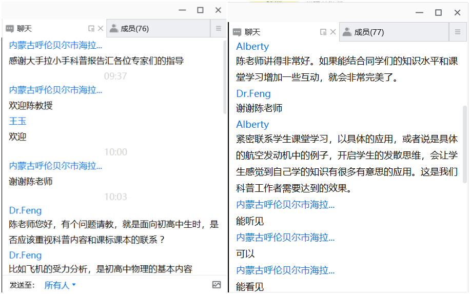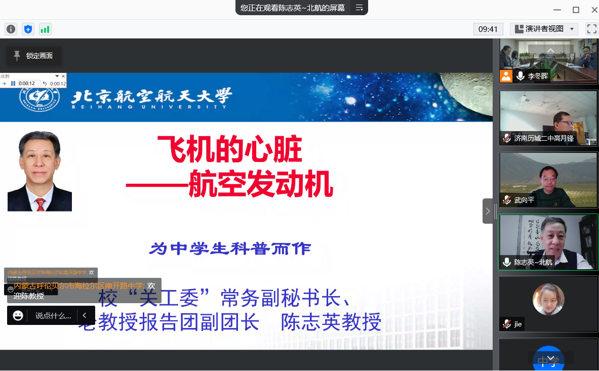 陈志英、崔凯等8位专家围绕航天科技、自然科学、地球地质、医疗健康等领域做了科普报告。多名北航老教授在线收看了报告内容。