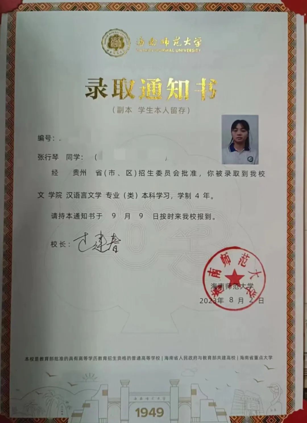 发来信息的是贵州省沿河民族中学的张行琴同学,今年九月她正式成为海南师范大学的一名大学生。