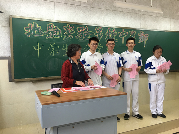 5月16日,受北航实验学校中学部团委邀请,北航实验学校中学部退休党员李景芬老师为北航实验学校中学部业余党校的近50名学生讲党课。