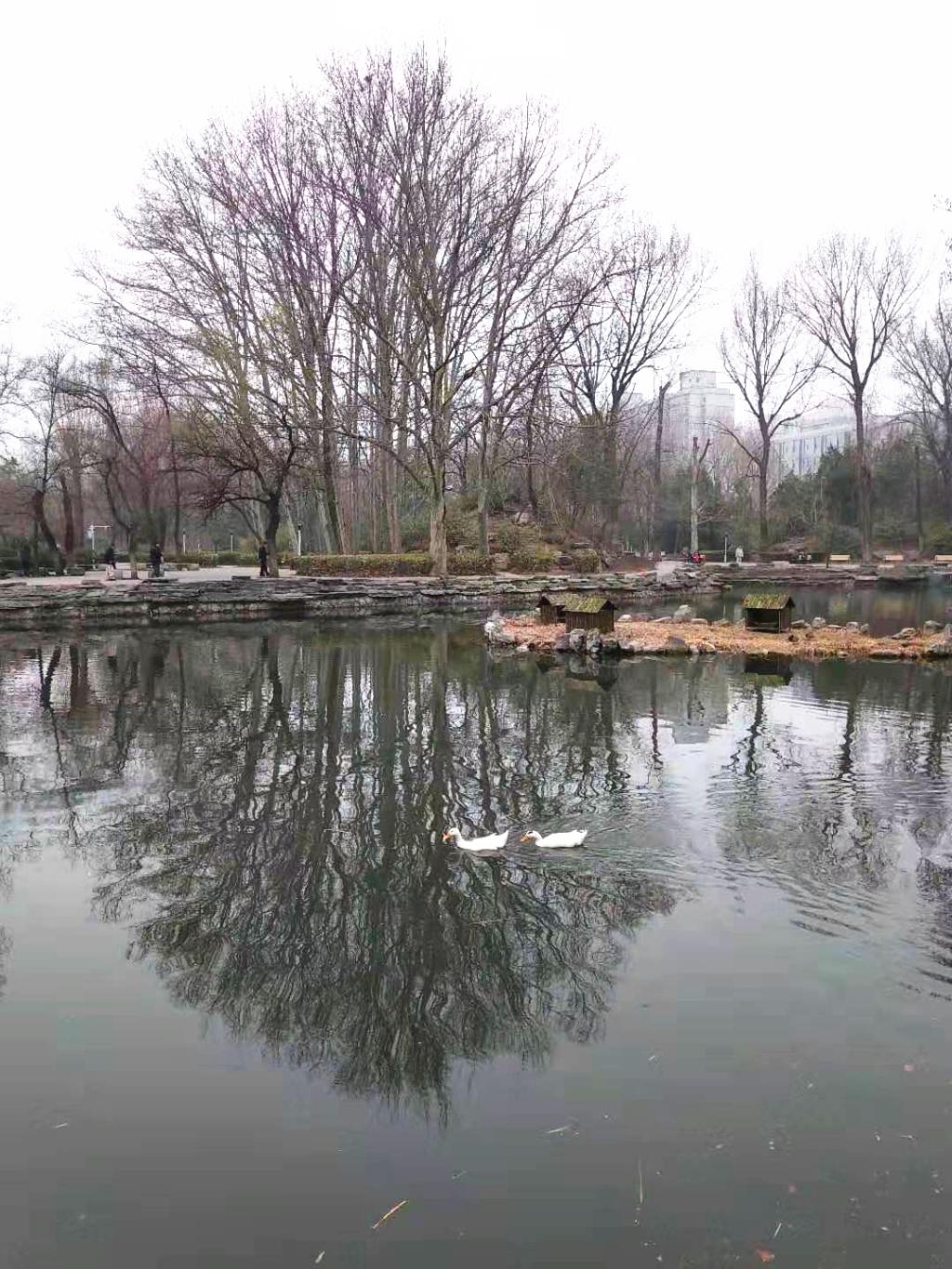 散步走到荷花池边,看到几个人把荷花池内浮动的残枝败叶打捞起来,堆积在岸边并准备运走,池里的水干净多了。池水在春风的吹拂下,微起波澜,水波涌动,一圈一圈的,煞是好看。两只白色的鸭子,在池中悠闲自在地游动,它们也在尽情地享受这干净的池水。