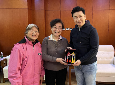在演出后台见到胡文阁老师后,赵老师表示想借用亲手编制的小挂饰,向胡老师表达广大老同志对京剧的喜爱之情,京剧作为国粹及中华优秀传统文化之一深入民心。胡文阁老师接到礼物,表示这是非常珍贵的礼物,和自己所从事的京剧艺术特别契合。非常感谢北航老师们的一片心意。