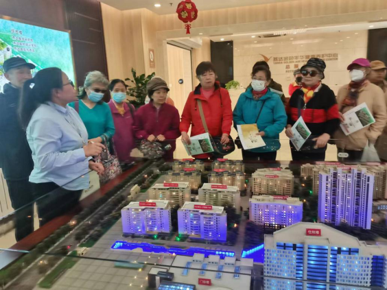 行车一小时左右,大家顺利到达目的地。田师傅在接待大厅用楼盘向大家详细介绍了社区的适老硬件设施、照料体系、医疗配套、入住费用以及兴趣活动开展等情况,并带领我们参观了样板间、老年大学、康复中心、游乐设施及社区的周边环境。