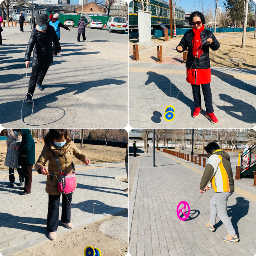 迎着春风,空竹这边也不甘示弱,线绳起落间上下翻飞起舞,小小的空竹仿佛拥有了生命。女同志们优美利落的操作尽显健康活力,引发阵阵叫好。