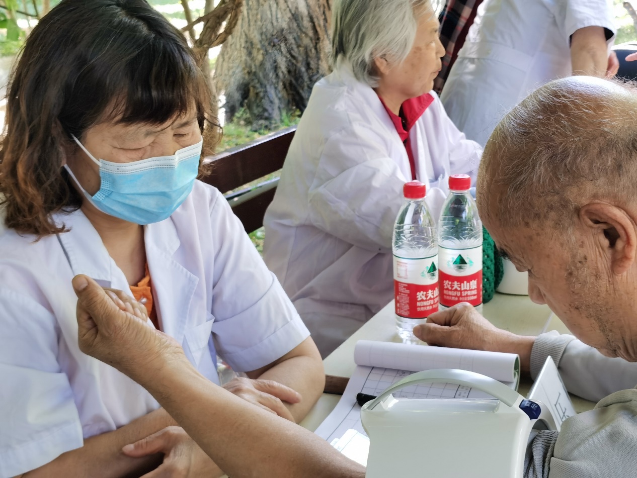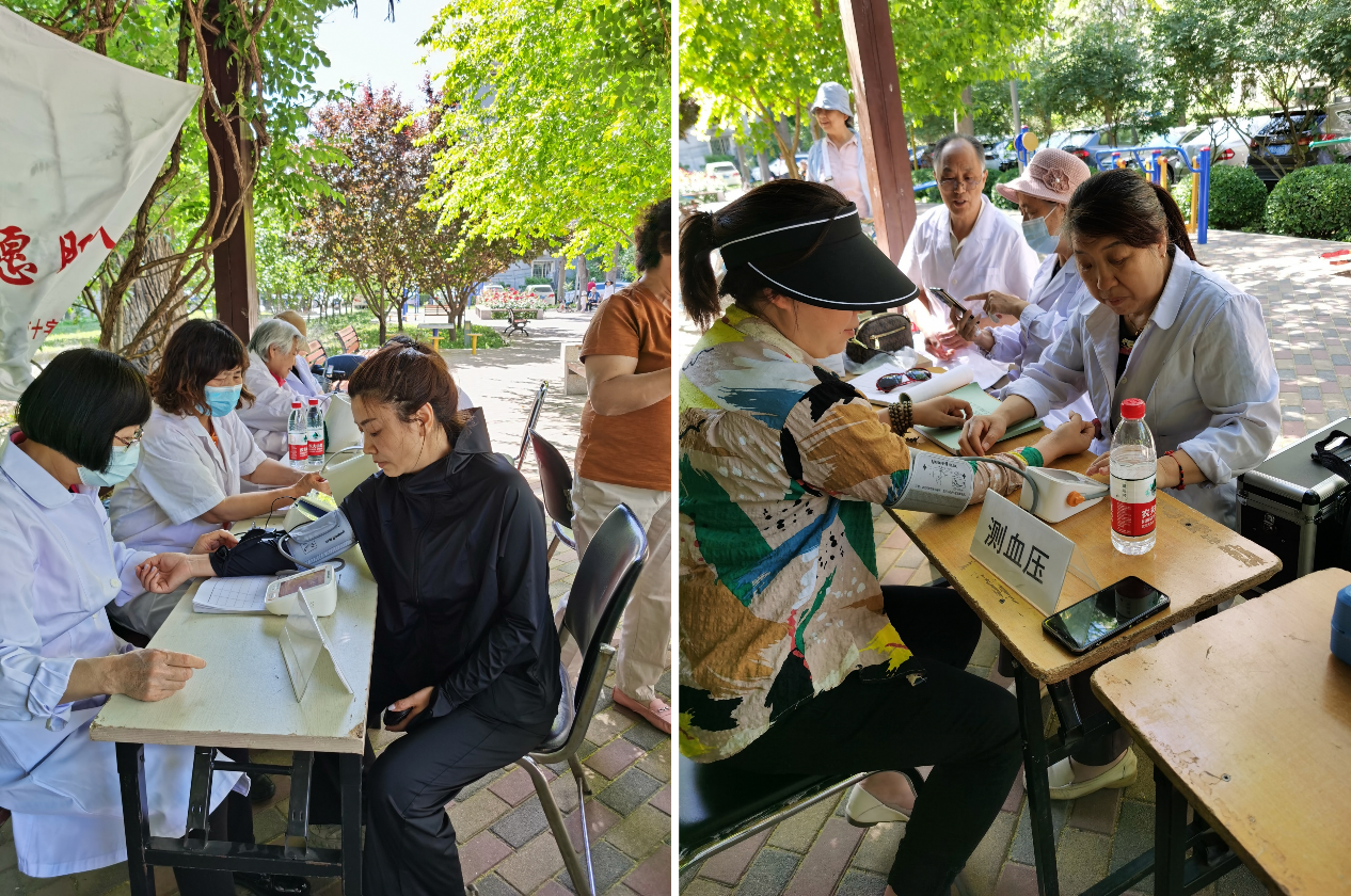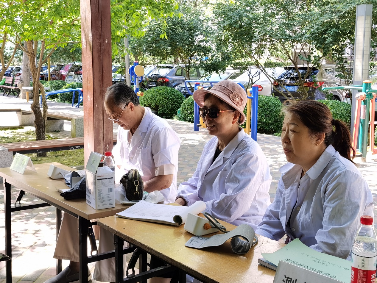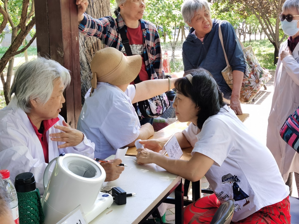 5月15日,北航北区口袋公园内,夏风徐徐,绿荫葱葱。校医院退休职工党支部(以下简称校医院支部)组织十多位大夫,在此向社区居民提供免费健康咨询和血压测量服务。