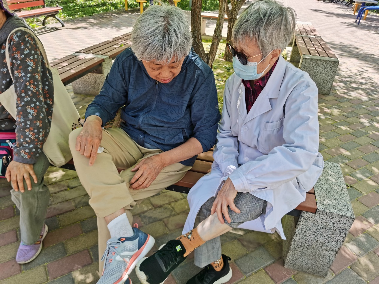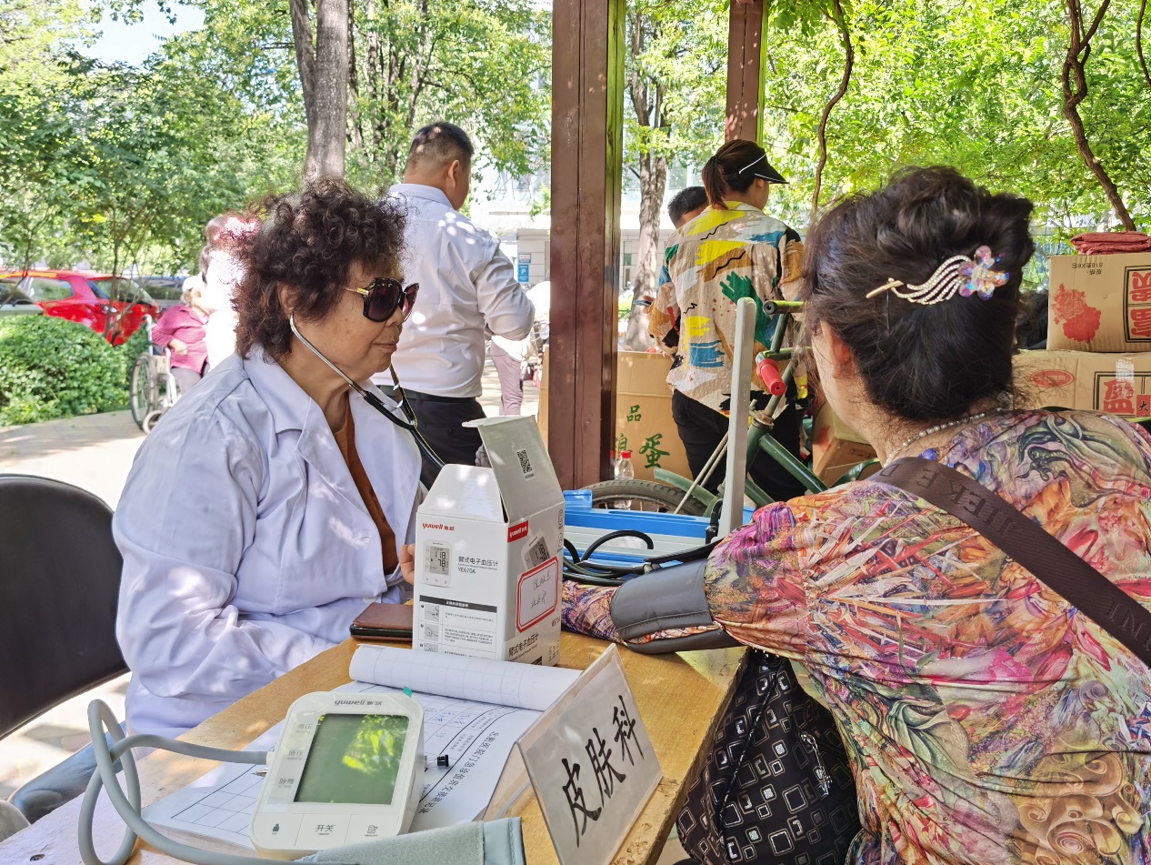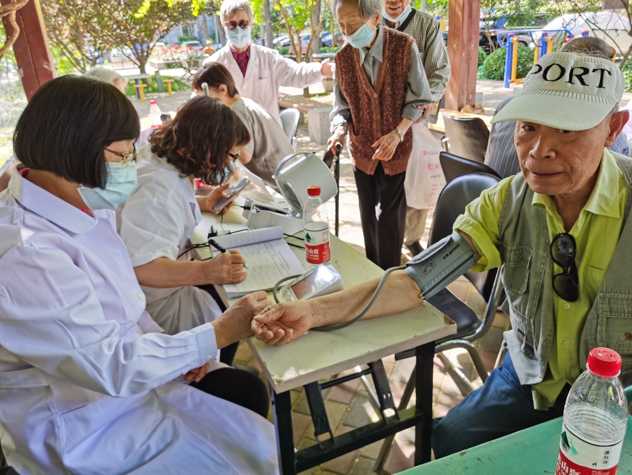 5月15日,北航北区口袋公园内,夏风徐徐,绿荫葱葱。校医院退休职工党支部(以下简称校医院支部)组织十多位大夫,在此向社区居民提供免费健康咨询和血压测量服务。