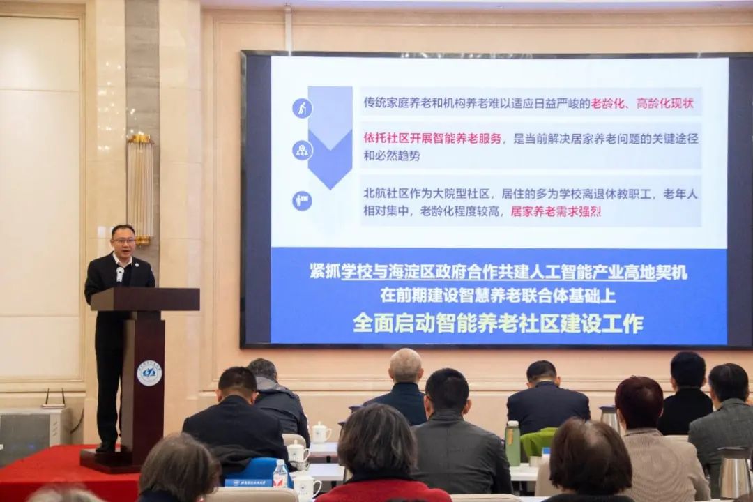 北航社区管理服务办公室主任兼社区党委书记梁国栋介绍了北航智能养老社区建设方案。为进一步创新社区居家养老服务模式,紧抓学校与海淀区政府合作共建人工智能产业高地契机,北航社区在前期智慧养老服务联合体工作基础上,聚焦社区老年人健康监测及慢病管理需求、居家安全需求、日常生活需求,与社会公益组织、专业服务机构、社会优质企业等合作重点建设社区居民健康数据监测和慢病管理平台、社区安全智能预警平台、社区居民生活智能服务平台,利用三年建设周期,最终实现各平台间的互联互通,形成“一张网、一键通、一体化”的智能养老服务模式,全面建成北航社区智能养老服务平台,为社区老年人提供更加优质的服务,并形成可持续发展、可推广复制的服务体系及模式,发挥示范引领作用。