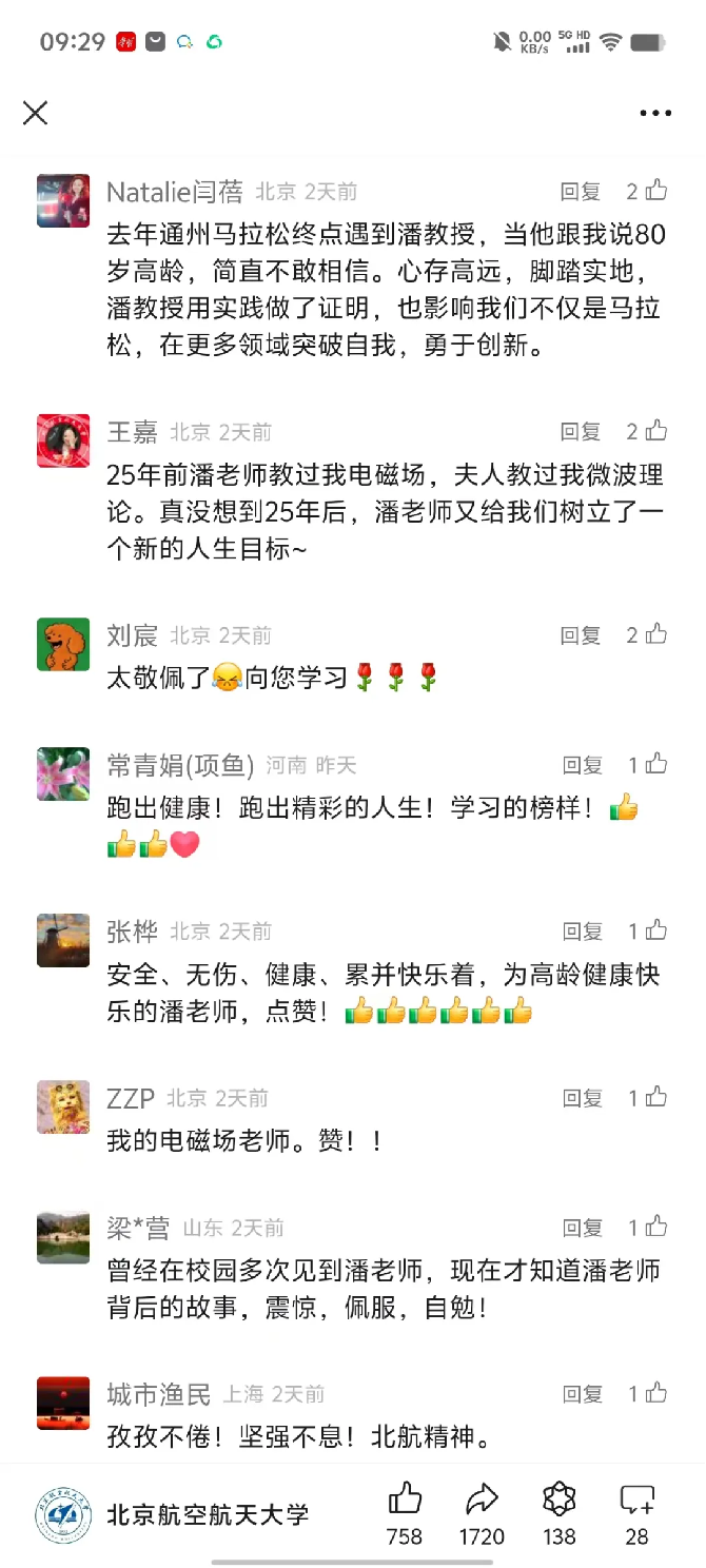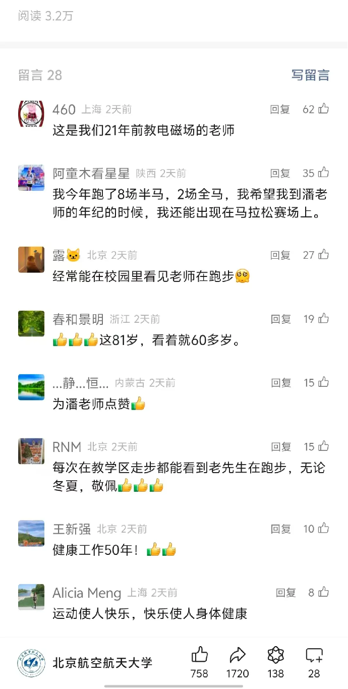 每天早上,北航师生都能在学校教学区的路上看到潘仲英跑步的身影,风雨无阻,无论暑热冬寒。“他真的像退休前研究课题一样在研究着如何科学跑步。”