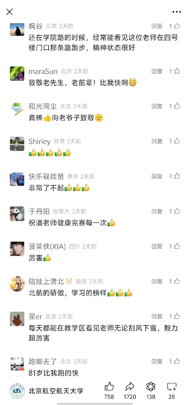 “经常能在学校看到老先生跑步,无论冬夏寒暑,敬佩!”