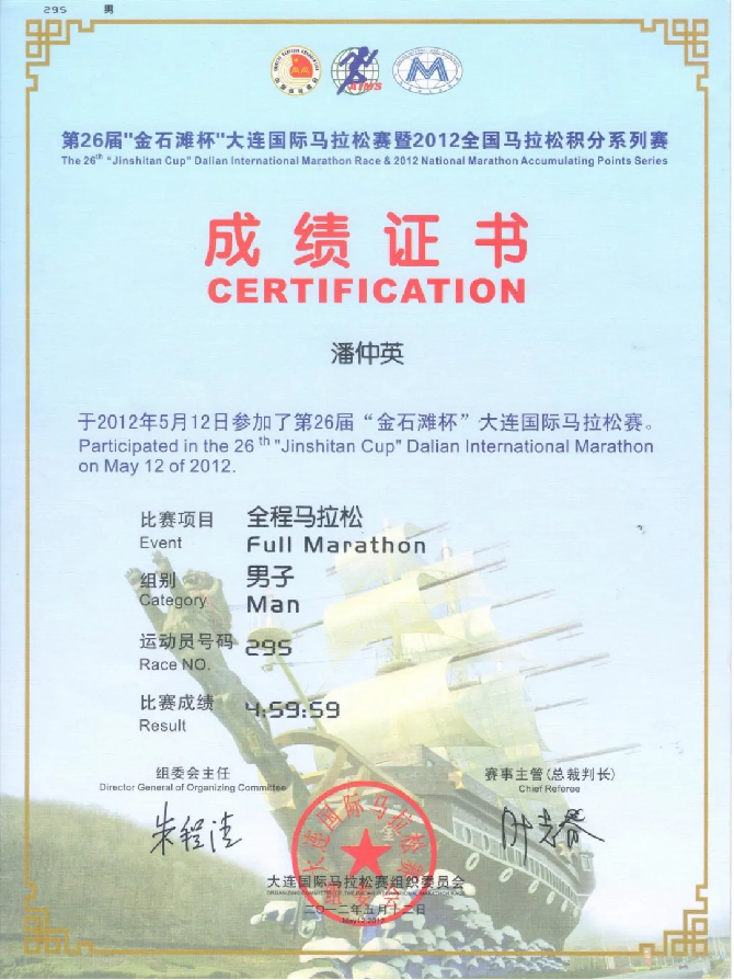 潘仲英完赛2012年大连马拉松的成绩证书