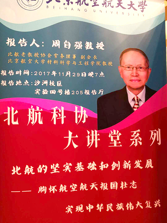 11月29日晚,“三老”协会报告团应邀走进北航科协大讲堂,承担第二讲讲座内容,“三老”协会报告团成员周自强教授在沙河校区实验四号楼205报告厅做了《北航的坚实基础和创新发展——胸怀航空航天报国壮志,实现中华民族伟大复兴》主题讲座。
