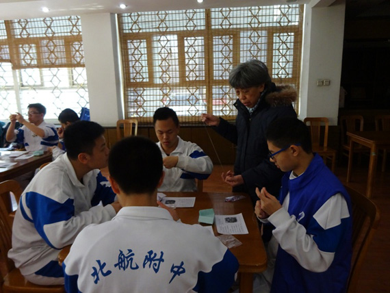 3月2日中午,一群来自北航附中的高中同学来到了思源楼一层思源厅。在全国学雷锋日即将到来之际,同学们与北航老年手工艺术协会的老师们开展了“大手拉小手”手工编织活动。